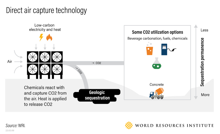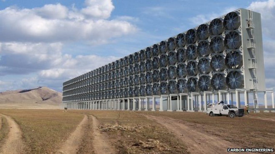 In this process, large structures are used to quite literally suck CO2 from the ambient air and bury it underground or in rocks or in products like concrete. These structures are powered largely by renewable energy.