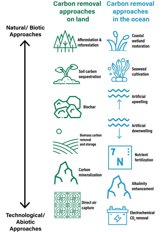 CDR (a rather self explanatory term), understandably, is the most widely and urgently needed tool to mitigate climate change. Think of CDR solutions like gigantic vacuum cleaners, which, can broadly be categorized as: